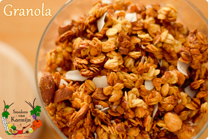 Soms kan het wel jaren duren voor ik echt tevreden ben over een recept . Dit is er zo een. In ons huis is grote behoefte aan granola en ik koop liever niet die suikerbommen uit de winkel, dus verzon ik weer een twist op het laatste recept waar ik toch nog niet helemaal tevreden over was. En dit was de eerste keer dat ik dacht, yes ik heb hem! Goede ingrediรซnten (dat wil zeggen geen geraffineerde suikers en vooral goodies) en een goede bereiding, waardoor de structuur perfect is…hรฉhรฉ, het duurde wat jaartjes, maar dan heb je ook wat. Kids en echtgenoot ook blij en het enige nadeel is dat de pot wel erg snel op is. Des te meer reden om het recept snel op mijn blog te zetten, want dan kunnen ze het zelf maken. Deze granola is niet te zoet, knapperig en vol smaak. De basis is havermout en appelmoes en uiteraard kun je qua verdere ingrediรซnten variรซren. Wij hebben er altijd graag noten en zaden doorheen en ook de kokosschilfers zijn favoriet, maar je kunt er bijvoorbeeld ook een keer cacaonibs door heen doen of cranberry’s. Heerlijk op de yoghurt, maar ook op een fruitsalade, een smoothiebowl of op gegrild fruit.