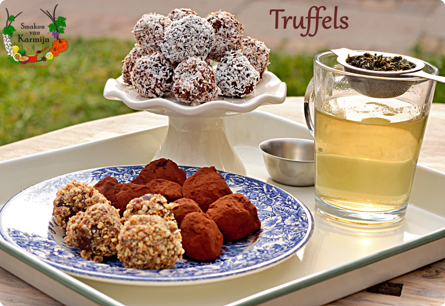Het is natuurlijk een mooie traditie die chocolade eitjes met Pasen, maar eerlijk gezegd zijn ze voor mij meestal te zoet en al die zilverpapiertjes vind ik ook niet zo prettig. Daarom maak ik in plaats van paaseieren te kopen liever zelf truffels. Lekker, makkelijk en leuk om te doen. Eerst maak je de ganache door warme room en boter over de fijgehakte chocolade te gieten. Je kunt voor klassiek gaan met slagroom en boter of voor kokosroom met kokosolie. Uiteraard kun je nog extra smaak toevoegen aan de ganache, zoals een lepeltje likeur, wat zeezout of gemalen gebrande nootjes. Laten opstijven in de koelkast en dan rol je er bolletjes van, die je door de kokos, cacao, gehakte nootjes of praliné kunt rollen. Een heerlijke afsluiting van een diner, Paasbrunch of misschien ga je dit jaar wel voor een Paas High tea, daar passen ze ook goed bij! Nou goed, eerlijk gezegd passen ze naar mijn idee altijd overal bij, Pasen is gewoon een goede smoes.
