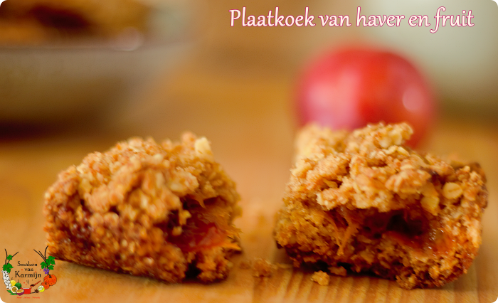 Een koekbodem dan een laagje kleverig fruit en een kruim bovenop, helemaal lekker. Dit was vroeger een zeer geliefde traktatie als mijn kids jarig waren. Haver is ook echt een geweldig product en ik maak er de laatste tijd weer heel veel mee, omdat we thuis proberen zoetigheid (behalve chocolade natuurlijk!) zelf te maken en zo min mogelijk te kopen. Als je dan iets snoept, dan weet je wat er in zit en ben je wat zuiniger, omdat het zelf gemaakt is, dubbel winst dus! En het is echt lekker hoor, zelfgemaakte haverkoeken, en ook nog voedzaam. Voor bij de thee of koffie, als toetje met wat slagroom of ijs en mee naar school of werk!
