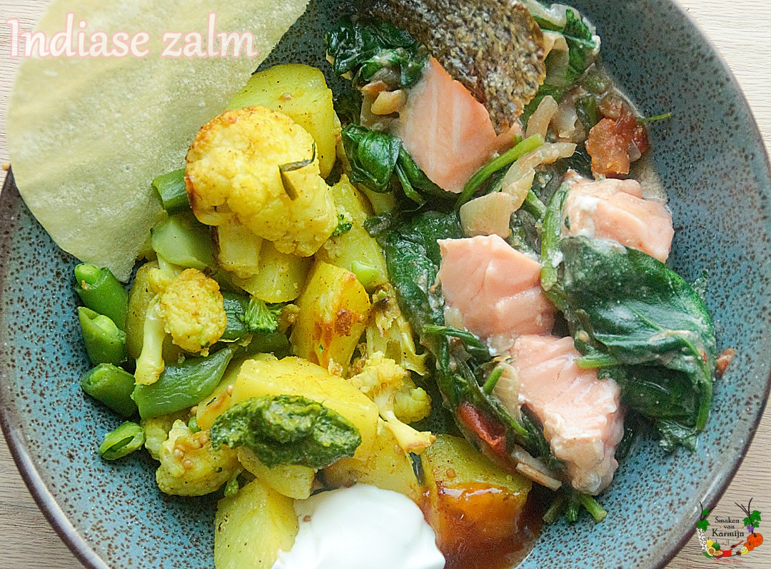 Zachte zalm met spinazie, tomaat, ui en heerlijke Indiase kruiden, dat is een ware traktatie! Zelfs mijn lieve niet-vis-liefhebbende dochter vindt dit gerecht altijd lekker. Het liefst geserveerd met kurkuma groenten, een beetje mango chutney, wat yoghurt en papadums. Met twee grote eters aan tafel, probeer ik vlees en vis wat bescheiden te houden, vanwege de prijs en duurzaamheid. Daarom vind ik het belangrijk veel groenten te maken, die echt lekker zijn klaar gemaakt. Veel smaak komt van het langzaam garen van de uien, knoflook, tomaat, kruidnagel, komijn, korianderzaad en chilivlokken. Daarop gaat de spinazie die slinkt met eventueel een beetje kokosroom en als laatste gaat het vuur uit, de zalmstukjes erop en met de deksel op de pan nog even 15 minuten geduld tot je een net gare, boterzachte zalm hebt. De kurkuma aardappels en bloemkool worden in de oven gegaard met veel knoflook, kurkuma en roomboter. Deze gerechten samen zijn gewoon ultiem genieten!