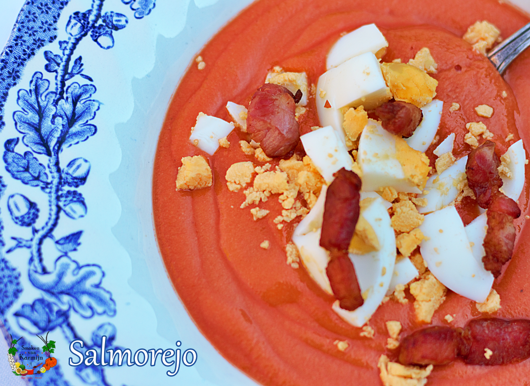 Dit is net als de Gazpacho een heerlijke koude tomatensoep uit het Zuid Spaanse Andalusië. De Salmorejo komt uit Córdoba, is dikker dan de Gazpacho en krjjgt altijd een topping van stukjes gekookt ei en serranoham. Op onze vakantie maakte we een doorreis door Andalusië en werd dit de dagelijkse favoriet van mijn zoon Thomas. Lekker fris, zout en vullend. Zoals onze Sevillaanse vriendin zo mooi zei; het is gewoon soep van een bocadillo con tomate y jamón (een hamtomaatsandwich)! Salmorejo vind je op de kaart van bijna elk lokaal restaurant en wordt gegeten als voorgerecht, lunch of als tapas. Gazpacho wordt daar meer als een drankje tussendoor genuttigd. Je kunt in de Spaanse supermarkten heerlijke kant en klare versies kopen van beide soepen, maar het is echt makkelijk en lekker om zelf te maken. Ik weet zeker dat dit ook bij jou elke zomer op tafel komt!