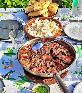 Nu ga je de groenten schikken in de schaal. Begin met de buitenring door om de beurt aubergine-paprika-courgette in een waaier neer te leggen, niet te plat leggen, want dan past het niet. Ga door met de volgende ring en als laatste de middelste. Snijd de mozzarella in halve plakken en schuif die hier en daar tussen de waaier, zodat het gelijk verdeeld is over de hele ratatouille. Bestrooi met verse peper en zout en rasp als laatste een goede hand Parmezaanse kaas over de ratatouille en schuif hem in de oven. Na 45 minuten haal je hem uit de oven en kun je hem het beste even 15 minuutjes afkoelen, zodat de hitte er een beetje af is. Serveer met vers (knoflook)stokbrood of focaccia (zie mijn focaccia recept) en/of bulgur en een frisse salade!
